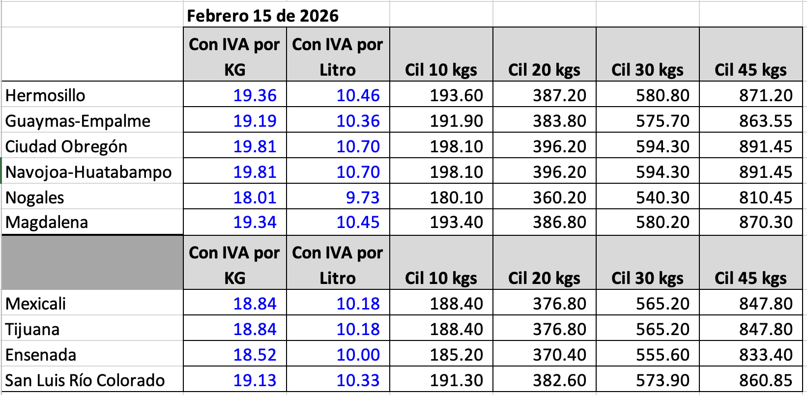 Les compartimos los precios del Gas LP estacionario y en cilindro que estarán vigentes en todas nuestras sucursales del 15 al 21 de febrero de 2026. Esto de acuerdo a lo publicado por la Comisión Nacional de Energía (https://www.gob.mx/cne). El precio por litro aplica también en nuestras estaciones de Gas LP