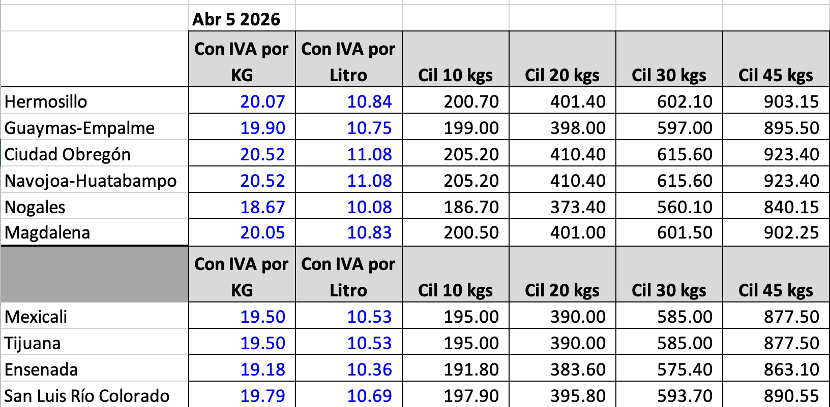 Les compartimos los precios del Gas LP estacionario y en cilindro que estarán vigentes en todas nuestras sucursales del Precios del Gas LP del 5 al 11 de abril de 2026. Esto de acuerdo a lo publicado por la Comisión Nacional de Energía (https://www.gob.mx/cne). El precio por litro aplica también en nuestras estaciones de Gas LP