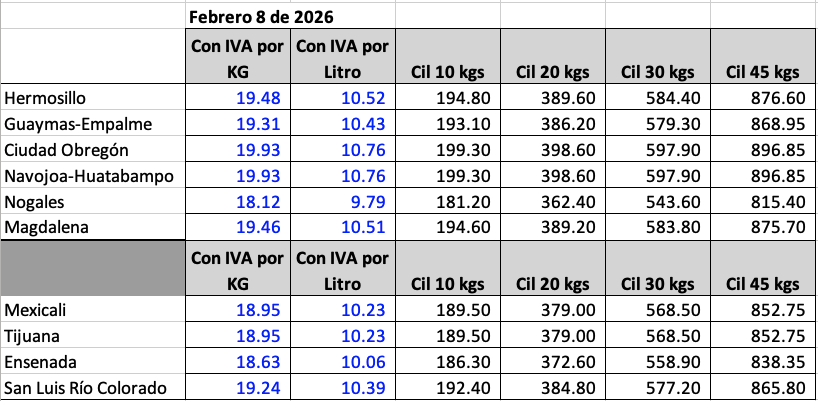 Les compartimos los precios del Gas LP estacionario y en cilindro que estarán vigentes en todas nuestras sucursales del 8 al 14 de febrero de 2026. Esto de acuerdo a lo publicado por la Comisión Nacional de Energía (https://www.gob.mx/cne). El precio por litro aplica también en nuestras estaciones de Gas LP